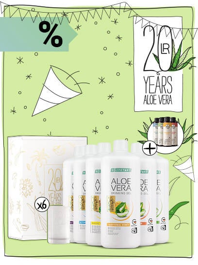 Voor deze erg speciale verjaardag hebben we deze maand een passende, enorm fantastische aanbieding: voor beperkte tijd hebben we voor onze LR LIFETAKT Aloe Vera Drinking Gels zes matchende glazen in zes jubileumdozen - en daarbovenop schenken we alle vier onze Soul of Nature douchegels gratis als cadeau!